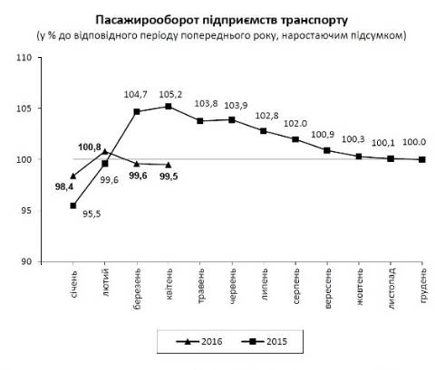 Загалом, у січні-квітні цього року усіма видами транспорту було перевезено 1830,7 млн. пасажирів, що є 99,5% від обсягу січня-березня минулого року.