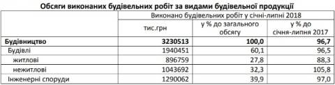 Спад обсягів будівельних робіт зафіксували на будівництві житла (на 11,7%) та інженерних споруд (на 3%). Натомість, порівняно з січнем-липнем 2017 року, на 5,8% зросли обсяги робіт на будівництві нежитлових будівель.