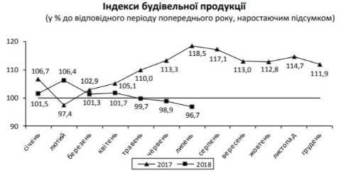 Відтак, індекс будівельної продукції у січні-липні 2018 року становив 96,7%, порівняно з цими місяцями 2017 року.