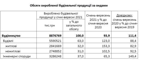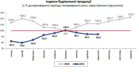 Індекс будівельної продукції у січні-вересні 2021 року, порівняно з цими місяцями минулого року, становив 93,9%.