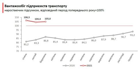 Вантажооборот підприємств транспорту становив 2349,2 млн.ткм і, порівняно з цими місяцями 2020 року, збільшився на 5%.