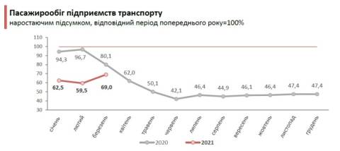 У січні-лютомуберезні цього року послугами пасажирського транспорту скористалися 35,8 млн пасажирів, що на 30,6% менше, порівняно з цими місяцями минулого року.