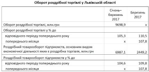 Зокрема, у січні-березні 2017 року обсяг обороту роздрібної торгівлі збільшився, порівняно із січнем-березнем 2016 року на 5,3% і становив 9698,9 млн грн.
