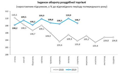 У серпні 2019 року, порівняно з цим місяцем 2018 року, оборот роздрібної торгівлі збільшився на 7,1%, а щодо липня цього року – на 0,9%.