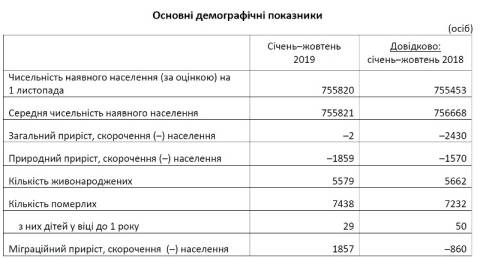 Зокрема, у Львові народились 5 579 дітей, що на 83 дитини або на 1,5% менше, порівняно з січнем-жовтнем минулого року, померло 7 438 осіб, що на 206 осіб або на 2,8% більше.