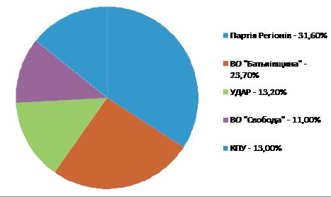 Партія Кличка УДАР набрала 13,2%, ВО «Свобода» – 11% та КПУ – 13%.