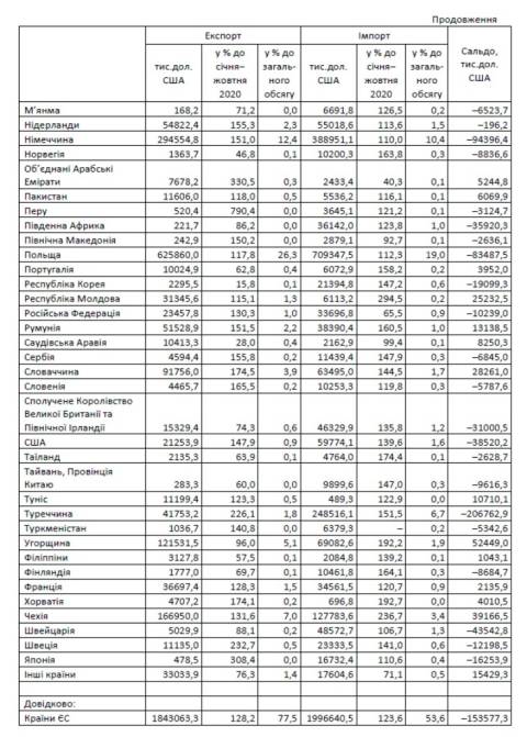Найбільші частки імпорту припали на Польщу (19,0% від загальнообласного імпорту), Китай (12,4%), Білорусь (10,9%) і Німеччину (10,4%). Імпорт товарів з країн Єврсоюзу становив 1996,6 млн дол (53,6%) і збільшився, порівняно з січнем‒жовтнем 2020 року, на 23,6%.