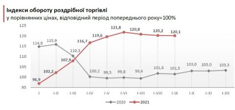 У структурі обороту роздрібної торгівлі 75,3% становив роздрібний товарооборот підприємств-юридичних осіб. Порівняно з січнем-вереснем 2020 року, роздрібний товарооборот підприємств зріс на 19,6%.