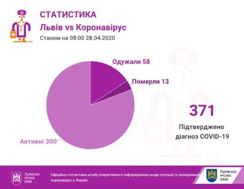 Станом на 08.00 год у Львові та Львівщині підтвердили 371 випадок інфікування коронавірусом, з них 13 випадків смертельні, а 58 пацієнтів одужали. Сьогодні від коронавірусу помер74-річний мешканець смт. Рудно.
