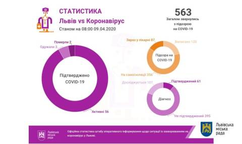 Станом на 08.00 год у Львові та Львівщині підтверджено 61 випадок інфікування коронавірусом, з них два випадки смертельні. Натомість станом на ранок 8 квітня у області було 29 випадків зараження.