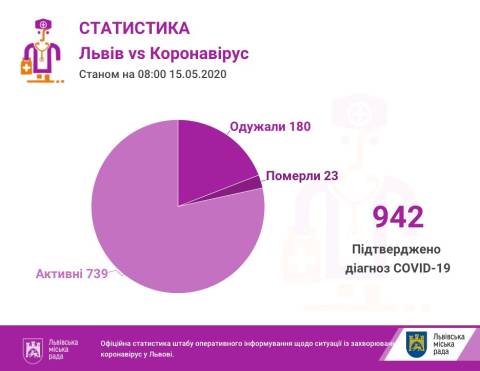 Станом на 08.00 год у Львові та Львівщині підтвердили 942 випадки інфікування коронавірусом, з них 24 випадки смертельні, а 180 пацієнтів одужали. 14 травня у госпіталі у Винниках померла 59-річна мешканка Новояворівська.