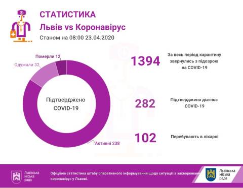 Станом на 08.00 год у Львові та Львівщині підтвердили 282 випадки інфікування коронавірусом, з них 12 випадків смертельні, а 32 пацієнти одужали.
