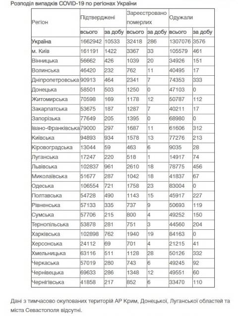 Станом на сьогодні в Україні зафіксували 1662942 випадки зараження коронавірусом та 32418 смертей.