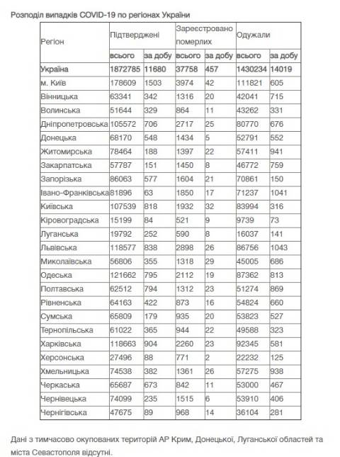 Станом на сьогодні в Україні зафіксували 1872785 випадків зараження коронавірусом та 37758 смертей.