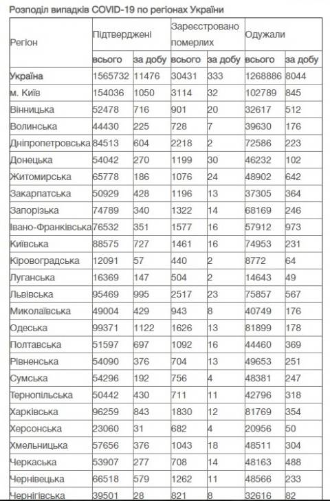 Станом на сьогодні в Україні зафіксували 1 565 732 випадки зараження коронавірусом та 30 431 смерть.
