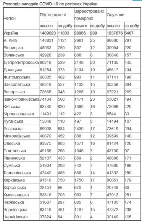 Станом на 09.00 год 17 березня в Україні зареєстрували 1489023 випадки зараження коронавірусом, з них 28986 людей померли, а 1237676 людей – одужали. За добу захворіли на коронавірус 11833 осіб.