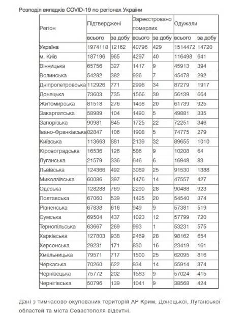 Станом на 09.00 год 22 квітня в Україні зареєстрували 1974118 випадків зараження коронавірусом, з них 40796 людей померли, а 1514472 людей – одужали. За добу захворіли на коронавірус 12 162 осіб.