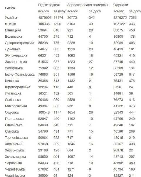 Станом на сьогодні в Україні зафіксували 1579906 випадків зараження коронавірусом та 30773 смертей.