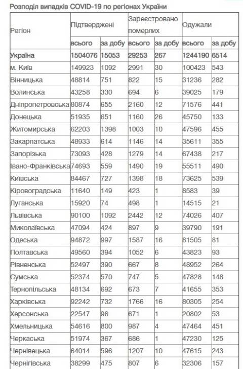 Станом на сьогодні в Україні зафіксували 1504076 випадків зараження коронавірусом та 29253 смертей.