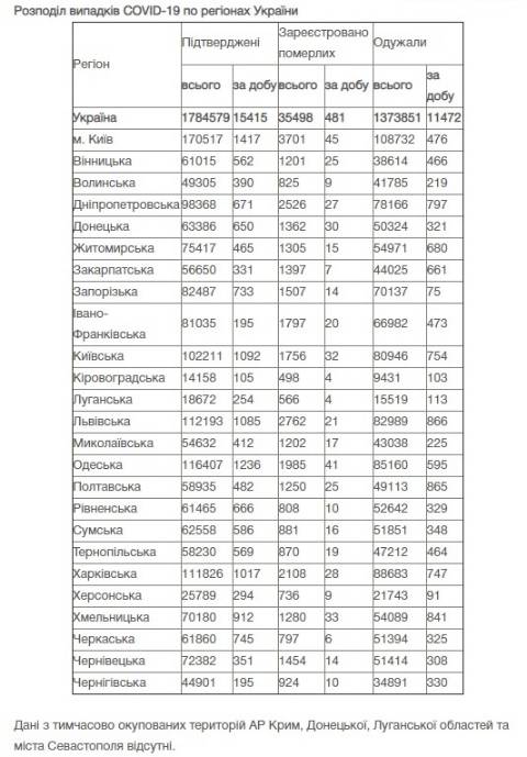 Станом на сьогодні в Україні зафіксували 1784579 випадків зараження коронавірусом та 35498 смертей.
