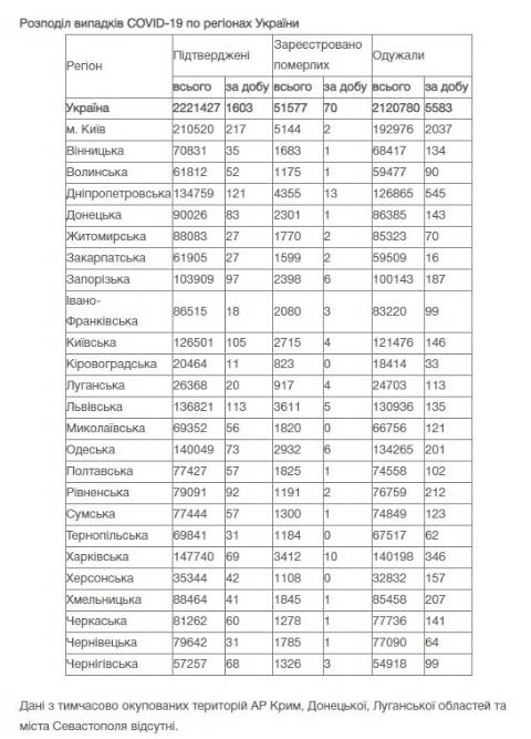 Станом на сьогодні в Україні зафіксували 2 221 427 випадків зараження коронавірусом та 51 577 смертей.