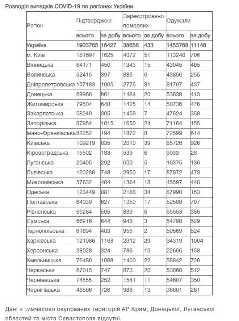 Станом на сьогодні в Україні зафіксували 1903765 випадків зараження коронавірусом та 38658 смертей.
