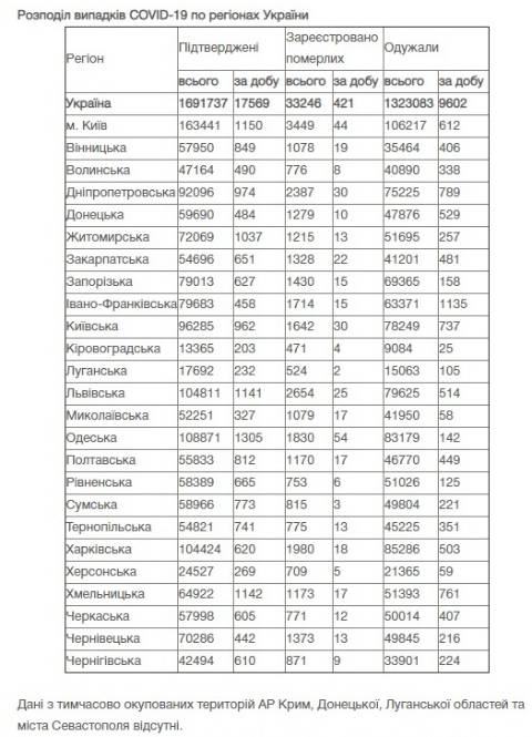 Станом на сьогодні в Україні зафіксували 1691737 випадків зараження коронавірусом та 33246 смертей.