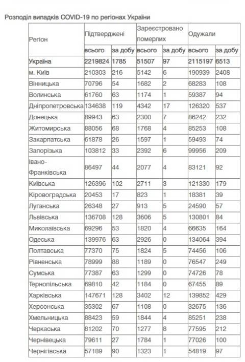Станом на сьогодні в Україні зафіксували 2 219 824 випадки зараження коронавірусом та 51 507 смертей.