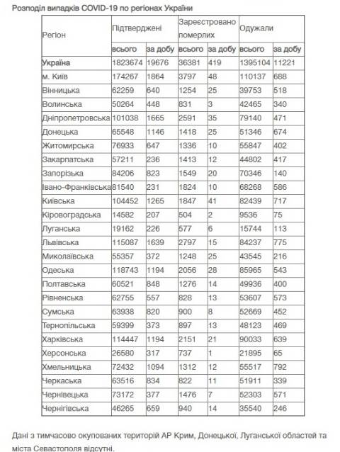 Станом на сьогодні в Україні зафіксували 1823674 випадки зараження коронавірусом та 36381 смерть.