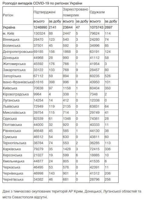 Станом на сьогодні в Україні зафіксували 1246990 випадків зараження коронавірусом та 23644 смертей.