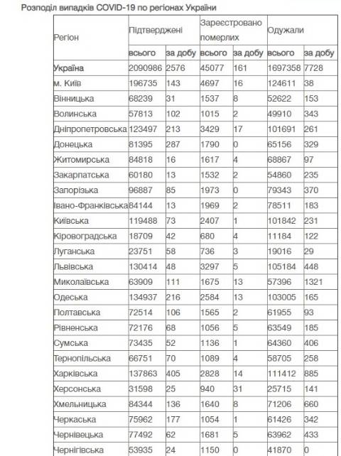 Станом на 09.00 год 5 травня в Україні зареєстрували 2090986 випадків зараження коронавірусом, з них 45077 людей померли, а 1697358 людей – одужали. За добу захворіли на коронавірус 2576 осіб.