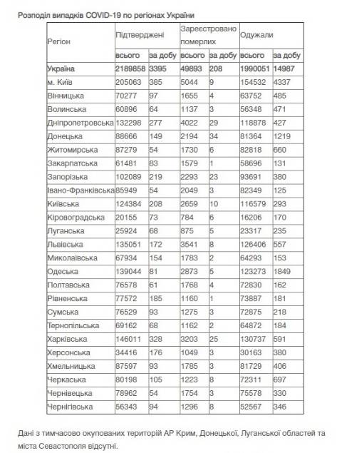 Станом на сьогодні в Україні зафіксували 2189858 випадків зараження коронавірусом та 49893 смертей.