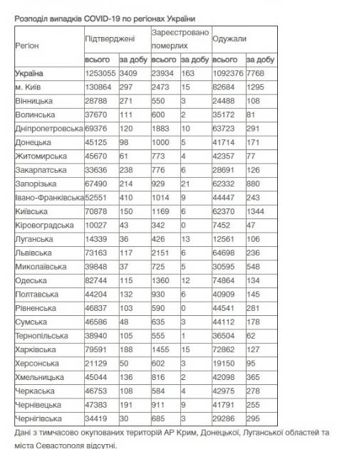 Станом на сьогодні в Україні зафіксували 1253055 випадків зараження коронавірусом та 23934 смерті.