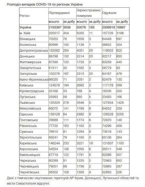 Станом на сьогодні в Україні зафіксували 2193367 випадків зараження коронавірусом та 50076 смертей.