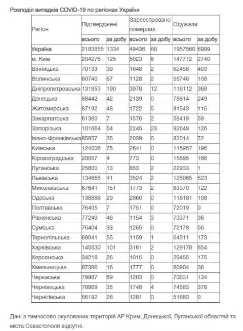 Станом на сьогодні в Україні зафіксували 2183855 випадків зараження коронавірусом та 49436 смертей.