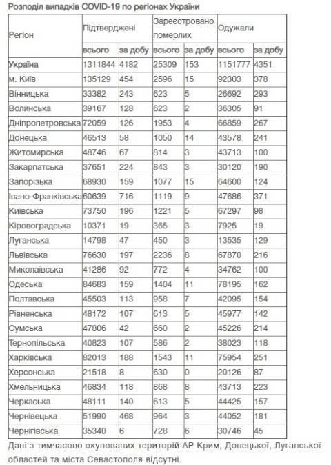 Станом на сьогодні в Україні зафіксували 1311844 випадки зараження коронавірусом та 25309 смертей.