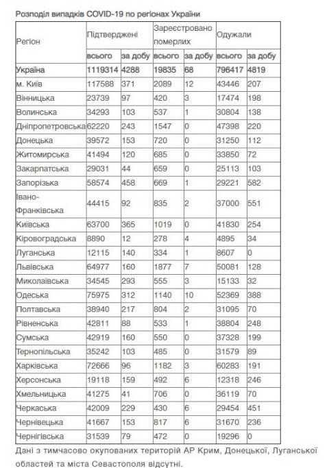 Станом на 09.00 год 11 січня в Україні зареєстрували 1119314 випадки зараження коронавірусом, з них 19835 людей померли, а 796417 людей – одужали. За добу захворіли на коронавірус 4288 осіб.