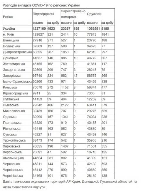 Станом на сьогодні в Україні зафіксували 1237169 випадків зараження коронавірусом та 23387 смертей.