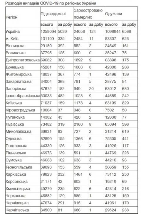 Станом на сьогодні в Україні зафіксували 1258094 випадки зараження коронавірусом та 24058 смертей.