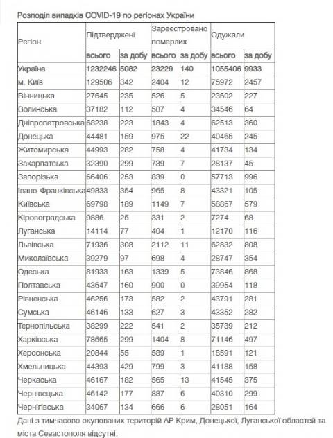 Станом на сьогодні в Україні зафіксували 1232246 випадків зараження коронавірусом та 23229 смертей.