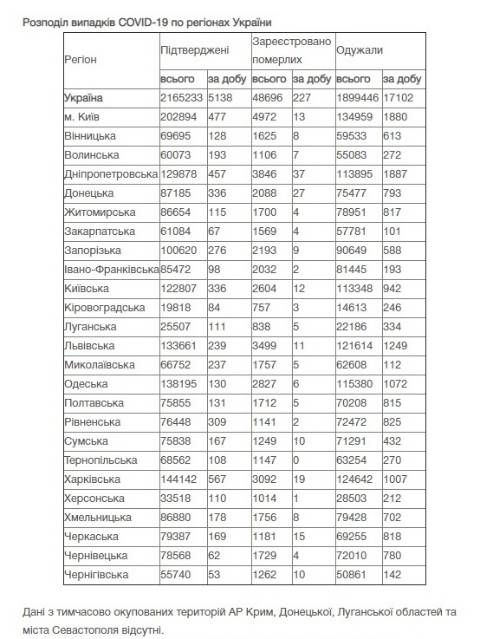 Станом на сьогодні в Україні зафіксували 2165233 випадки зараження коронавірусом та 48696 смертей.