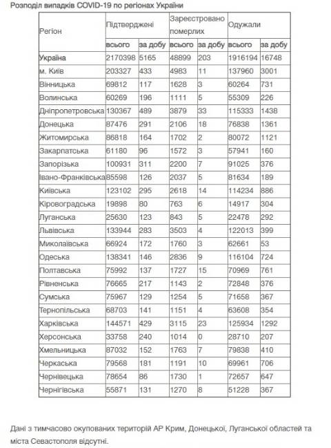 Станом на сьогодні в Україні зафіксували 2170398 випадків зараження коронавірусом та 48899 смертей.
