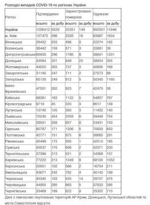 Станом на сьогодні в Україні зафіксували 1206412 випадків зараження коронавірусом та 22351 смерть.