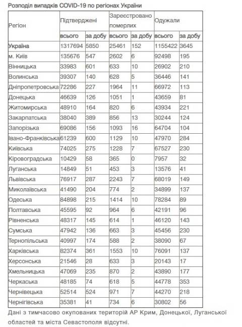 Станом на сьогодні в Україні зафіксували 1317694 випадки зараження коронавірусом та 25461 смерть.