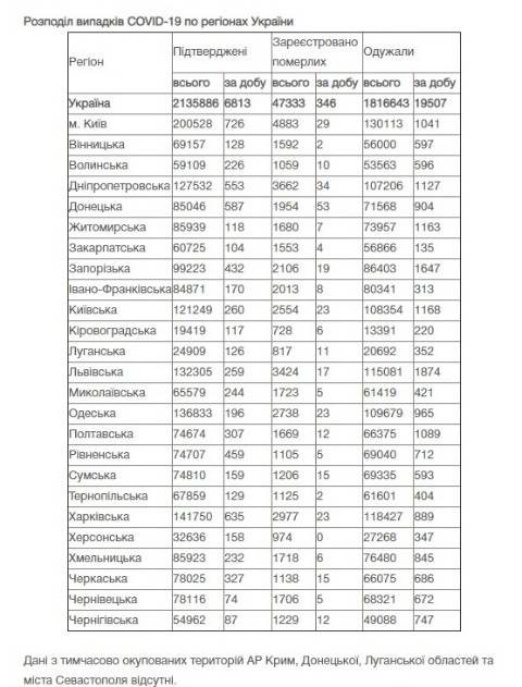 Станом на сьогодні в Україні зафіксували 2135886 випадків зараження коронавірусом та 47333 смерті.