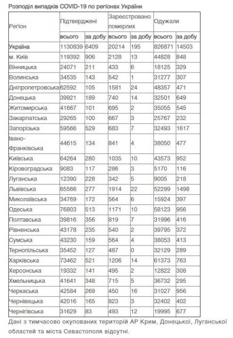 Станом на сьогодні в Україні зафіксували 1130839 випадків зараження коронавірусом та 20214 смертей.
