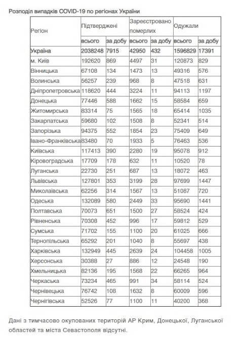 Станом на сьогодні в Україні зафіксували 2038248 випадків зараження коронавірусом та 42950 смертей.