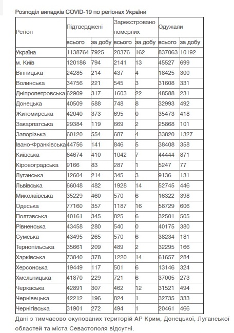 Станом на сьогодні в Україні зафіксували 1138764 випадки зараження коронавірусом та 20376 смертей.