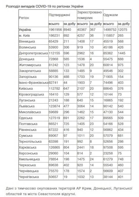 Станом на сьогодні в Україні зафіксували 1961956 випадків зараження коронавірусом та 40367 смертей.