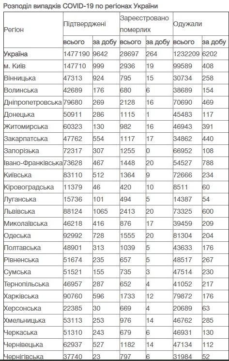 Станом на 09.00 год 16 березня в Україні зареєстрували 1477190 випадків зараження коронавірусом, з них 28697 людей померли, а 1232209 людей – одужали. За добу захворіли на коронавірус 9642 осіб.